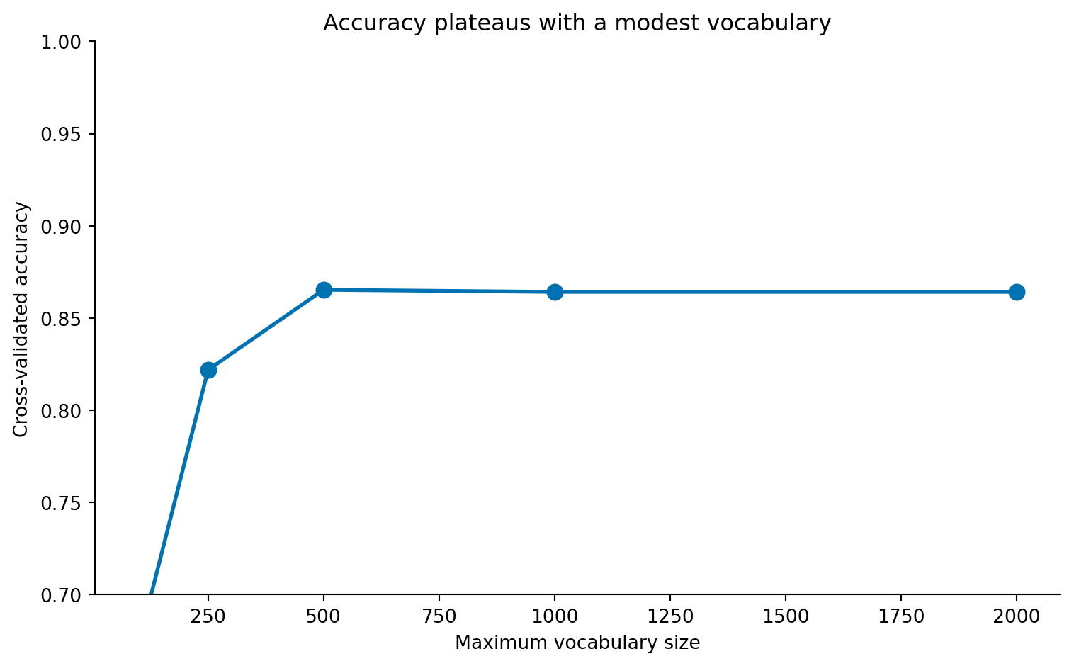 Mitigations within the bag-of-words framework include: (a) **bigrams**: "not working" becomes a single feature, distinct from "working" alone. We already used bigrams in our configuration, which partially addresses this. (b) **Negation tagging**: a preprocessing step that appends "NOT_" to every word following a negation word until the next punctuation mark, turning "not working properly" into "NOT_working NOT_properly." This is a simple heuristic but surprisingly effective. (c) **Character n-grams**: using subword features (3–5 character sequences) rather than full words, which captures morphological patterns but not syntactic negation. None of these fully solve the problem; for tasks where negation is critical, contextual models (such as pre-trained language models) provide substantially better handling.