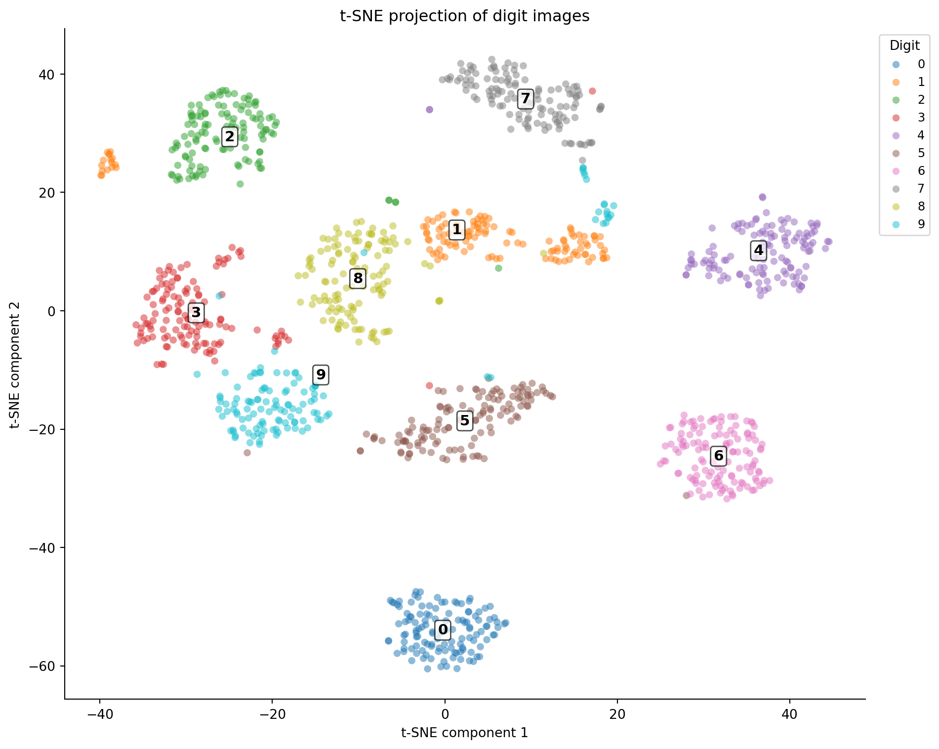 t-SNE reveals local neighbourhood structure that PCA's linear projection misses. Digit classes that overlap heavily in PCA space, particularly 3, 5, and 8, form distinct (though sometimes nearby) clusters in t-SNE space. This is because t-SNE optimises for preserving local distances: points that are close in the original 64-dimensional space should be close in the 2D embedding. PCA optimises for preserving global variance, which means it can conflate locally distinct clusters that happen to lie along the same directions of maximum spread.